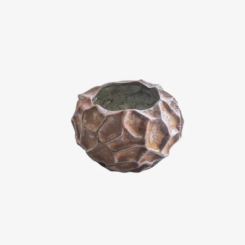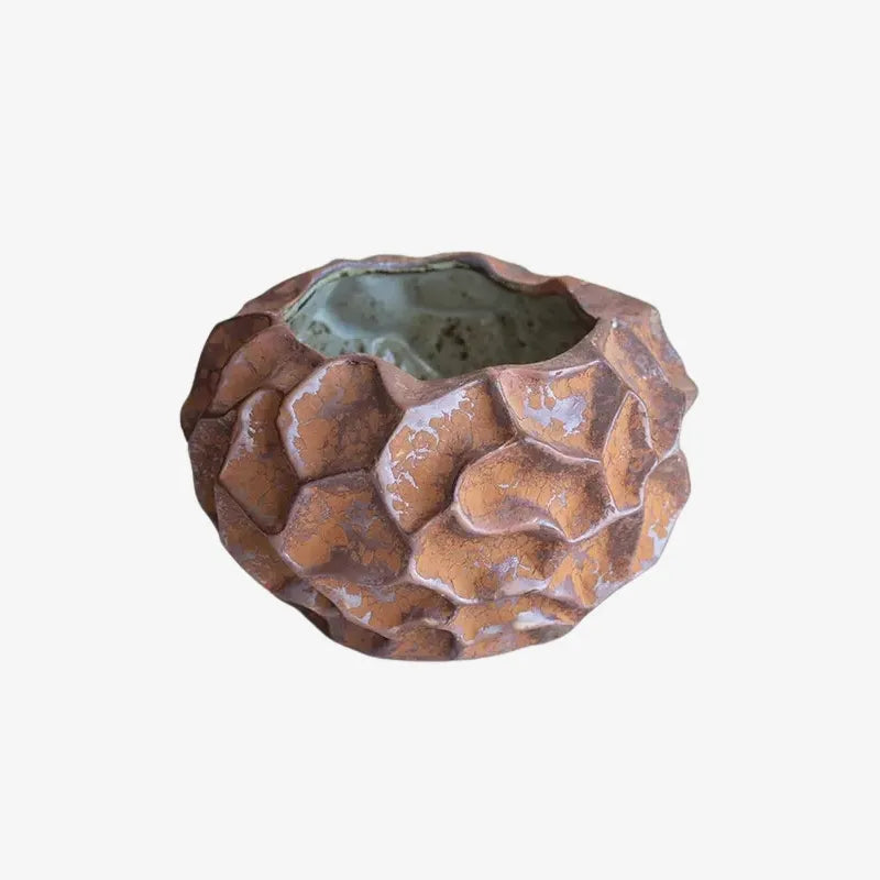 Conçu en céramique avec une finition effet pierre, ce vase imite parfaitement l’aspect des roches volcaniques. Sa surface irrégulière contraste avec son intérieur émaillé, créant un équilibre fascinant entre rudesse extérieure et douceur intérieure.